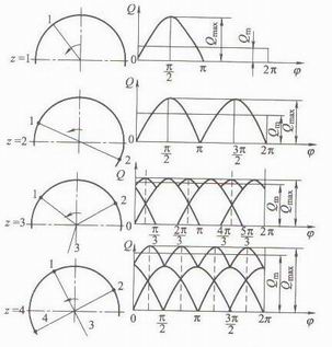 往復(fù)泵的瞬時(shí)流量,在不考慮任何容積損失的前提下,往復(fù)泵在每一瞬間排出的流量稱為理論瞬時(shí)的流量,簡(jiǎn)稱瞬時(shí)流量。多缸往復(fù)泵的瞬時(shí)流量之所有液缸在同一瞬時(shí)排出的流量之和。
