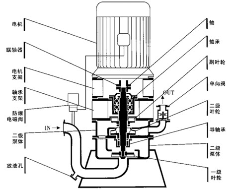WFB型無密封自控自吸泵主要由泵體、葉輪、泵蓋、導(dǎo)葉、副葉輪、泵軸、連接架、電動空氣控制閥等部分組成。該泵體內(nèi)部由吸入室、儲液室、氣液分離室等部分組成。泵在正常起動后,葉輪將吸入室所存的液體及吸入管路中的空氣一起吸入,液體混合氣體在葉輪高速旋轉(zhuǎn)的離心力作用下經(jīng)導(dǎo)葉拋入氣液分離室,由于流速突然降低,氣體與液體的比重不同,較輕的氣體從混合液中分離出來并被排出泵外,脫氣的液體重新進(jìn)入工作腔與葉輪內(nèi)部從吸入管路中吸入的空氣再次混合,在葉輪的旋轉(zhuǎn)的作用下,很快使泵體入口形成一定的真空度,從而達(dá)到自吸的目的。由于該泵具有獨特的排氣功能,因此該泵能輸送含有氣體的液體并無須安裝底閥。該泵配有“電動空氣控制閥”運行時,控制閥關(guān)閉,實現(xiàn)密封;停機后控制閥打開,破壞了吸入管路中的真空,防止停機后泵腔內(nèi)的液體因缸吸作用而眾吸入管路流出,使泵腔內(nèi)保存足夠的液體來繼續(xù)完成自吸過程,從而實現(xiàn)了“首次引流、自吸”。