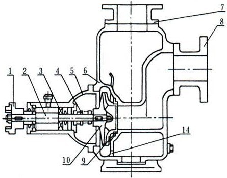 CYZ-A型自吸油泵均采用軸向回液的泵體結構。泵體由吸人室、儲液室、渦卷室、回液孔、氣液分離室等組成,泵正常起動后,葉輪將吸人室所存的液體及吸人管路中的空氣一起吸人,并在葉輪內(nèi)得以完全混合,在離心力的作用下,液體夾帶著氣體向渦卷室外緣流動,在葉輪的外緣上形成有一定厚度的白色泡沫帶及高速旋轉液環(huán)。氣液混合體通過擴散管進入氣液分離室。此時,由于流速突然降低,較輕的氣體從混合氣液中被分離出來,氣體通過泵體吐出口繼續(xù)上升排出。脫氣后的液體回到儲液室,并由回流孔再次進入葉輪,與輪內(nèi)部從吸人管路中吸人的氣體再次混合,在高速旋轉的葉輪作用下,又流向葉輪外緣。隨著這個過程周而復始地進行下去,吸人管足各中的空氣不斷減少,直到吸盡氣體,完成自吸過程,泵便投入正常作業(yè)。因為該泵具有這種獨特的排氣能力,所以此泵能輸送含有氣體的液體,無需安裝底閥,使用在油輪上時具有良好的掃艙功能。