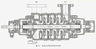 蝸殼式多級泵的結(jié)構特點(圖3 5)一般采用中開式結(jié)構以便于檢修,且有利于葉輪對稱布置,減,作用在轉(zhuǎn)子上的軸向力。但這種結(jié)構的工藝性較差:級數(shù)越多,泵體和系蓋的形狀越復;.泵的外形尺寸越大,特別是級與級之間需要配置一些級間流道,使泵的外形比較復雜。