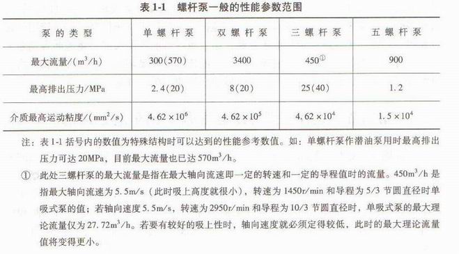 表1-1和表1-2中性能參數(shù)范圍和應(yīng)用場合僅僅是泛指某類螺桿泵的一般情況,并不是包括該類螺桿泵的各種都是如此。其性能參數(shù)值也不是的。如表1-1中雙螺桿泵*高排出壓力為8(20)mpa,是指