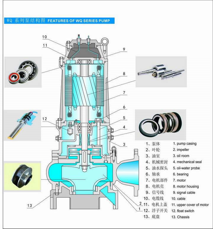 WQP系列不銹鋼潛水排污泵由電機(jī)與泵兩部分組成,二者通過油隔離室及機(jī)械密封組件隔開,屬機(jī)電一體化產(chǎn)品,電機(jī)與泵合用同一軸(轉(zhuǎn)子)整個水泵長度短,結(jié)構(gòu)緊湊。配備多種保護(hù)裝置,使得泵運(yùn)行可靠,其主部件作用如下: