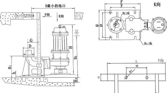 潛水電泵出水法蘭與出水管路系統(tǒng)自動(dòng)對(duì)接的自動(dòng)耦合裝置,由潛水電泵出水法蘭、附加耦合法蘭和出水管座進(jìn)口法蘭組成,在附加耦合法蘭和出水管座進(jìn)口法蘭的兩側(cè)各有一對(duì)楔卡且楔點(diǎn)的位置在法蘭的水平中心線附近。當(dāng)潛水電泵從水坑上方降落時(shí),附加耦合法蘭兩側(cè)的楔卡和出水管座進(jìn)口法蘭兩側(cè)的楔卡就卡到一起,在潛水電泵自重和楔卡斜面的作用下,兩個(gè)法蘭面緊緊地貼在一起,就好比兩個(gè)法蘭的兩側(cè)用兩個(gè)螺栓上緊了一樣,潛水電泵的水壓再大也不能推開法蘭面而大量漏水。當(dāng)潛水電泵從水坑內(nèi)往上提起來時(shí),兩對(duì)楔卡能夠沿斜面方便的脫開,從而實(shí)現(xiàn)自動(dòng)耦合裝置的功能。它可以在方便潛水電泵自動(dòng)裝拆的同時(shí),解決耦合的兩個(gè)法蘭之間大量漏水的問題,從而節(jié)約能源。 (2)自動(dòng)耦合式潛污泵的安裝方式 自動(dòng)耦合式潛污泵安裝主要是耦合裝置的安裝和泵的吊裝。安裝前在泵吊環(huán)上系上鏈鎖,供起吊與下泵之用。 耦合裝置的安裝步驟:偶合架用四個(gè)螺栓固定于泵體;出水管固定于基底;定位錐體安裝于出水管座;導(dǎo)管下端套在定位錐體上,上端套在導(dǎo)桿架的橡膠塊上;*后將導(dǎo)桿架固定于水池壁。橡膠塊的作用:用導(dǎo)桿架上的螺釘調(diào)節(jié)橡膠塊的軸向壓緊程度,使橡膠塊的直徑與導(dǎo)桿內(nèi)徑相吻合,讓導(dǎo)桿穩(wěn)定。 泵的安裝步驟:起吊水泵,將耦合架上的導(dǎo)向孔對(duì)準(zhǔn)導(dǎo)桿,徐徐放下吊索,使泵沿導(dǎo)桿自由下滑,泵體出口與出水管座口即自動(dòng)對(duì)準(zhǔn);松開吊索,在泵的自重作用下,使耦合架上的斜面與出水管座上相對(duì)應(yīng)的斜面楔緊,泵體法蘭面與出水管座密封面即可緊密貼合,這樣就實(shí)現(xiàn)了泵和出水管座的自動(dòng)耦合。需要起吊時(shí),只需拉起吊索,使泵和耦合架與出水管脫開,將泵與耦合架沿導(dǎo)桿拉起即可。
