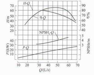①性能曲線圖 泵的性能曲線應(yīng)采用圖4-23的形式,橫坐標(biāo)表示流量Q,縱坐標(biāo)軸分別表示揚(yáng)程H、軸功率P和效率η根據(jù)測(cè)定與計(jì)算得出的數(shù)據(jù)繪制曲線,