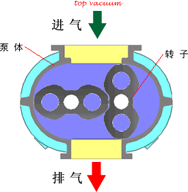 羅茨泵的結(jié)構(gòu)如圖所示。在泵腔內(nèi),有二個(gè)“8”字形的轉(zhuǎn)子相互垂直地安裝在一對(duì)平行軸上,由傳動(dòng)比為1的一對(duì)齒輪帶動(dòng)作彼此反向的同步旋轉(zhuǎn)運(yùn)動(dòng)。在轉(zhuǎn)子之間,轉(zhuǎn)子與泵殼內(nèi)壁之間,保持有一定的間隙,可以實(shí)現(xiàn)高轉(zhuǎn)速運(yùn)行。由于羅茨泵是一種無(wú)內(nèi)壓縮的真空泵,通常壓縮比很低,故高、中真空泵需要前級(jí)泵。