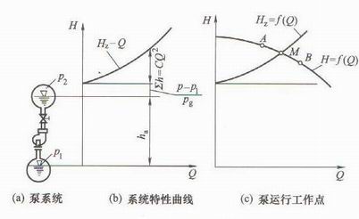 把泵特性曲線Η=f(Q)與系統(tǒng)特性曲線Ηz=f(Q)畫(huà)在同一張圖上,泵特性曲線與系統(tǒng)特性曲線的交點(diǎn)M就是泵運(yùn)行時(shí)的工作點(diǎn),如圖2-97(c)所示,在該點(diǎn)單位重量液體通過(guò)泵增加的能量(泵揚(yáng)程H )正好等于把單位重量液體從吸水池送到排水池液面需要的能量(即系統(tǒng)揚(yáng)程Hz),故m點(diǎn)是泵穩(wěn)定的運(yùn)行點(diǎn)。如果泵偏離M點(diǎn)在A點(diǎn)工作。這時(shí)H>Hz,多余的能量促使管內(nèi)流速增加,泵的流量增加,工作點(diǎn)從A移向M 點(diǎn)。反之,如泵在 B點(diǎn)工作,這時(shí)H<Hz,管內(nèi)流速減慢,泵流量減小,從B點(diǎn)移向M點(diǎn)。*后都要回到M點(diǎn)穩(wěn)定下來(lái),故泵的穩(wěn)定點(diǎn)一定是泵特性曲線的交點(diǎn)。但是對(duì)有駝峰附近時(shí),一旦偏離,將回不到M點(diǎn)。因此一般不允許采用有駝峰性能曲線的泵。